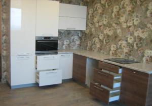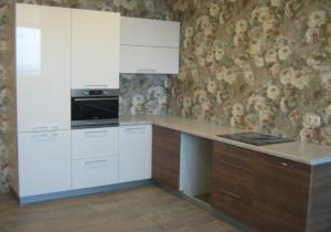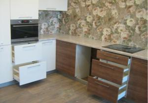 Фурнитура: фурнитура Samet, ручки рейлинг, газ-лифт, выдвижные ящики шариковые направляюшие, плинтус, цоколь, сушка хром, петли с доводчиком, мойка керамика, подъемный механизм авентос BLUM