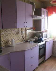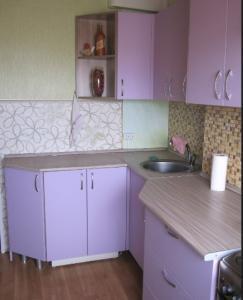 Кухонный гарнитур Г-образный: 3300х1650мм Корпус ЛДСП 16 мм Lamarty Белый Фасады: МДФ ПВХ (пленка матовая) Сирень Столешница 26мм Скиф (Россия) Фурнитура: фурнитура Samet, ручки рейлинг, газ-лифт, выдвижные ящики шариковые направляющие, плинтус, цоколь, сушка хром, петли с доводчиком, мойка металл