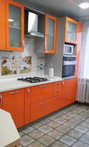 Кухонный гарнитур Г-образный: 3400х1750мм Корпус ЛДСП 16 мм Lamarty Серый Фасады: МДФ ПВХ (пленка глянец) Оранжевый Столешница 38мм Геталит (Германия) Фурнитура: фурнитура BLUM, ручки скоба, газ-лифт, выдвижные ящики тандембокс, плинтус, цоколь, сушка хром, петли с доводчиком, мойка металл, подъемные механизмы авентос BLUM