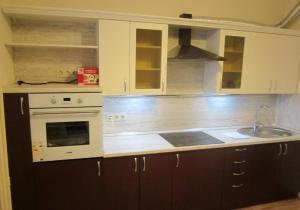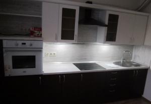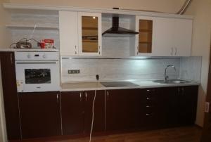 Кухонный гарнитур прямой: 3300мм Корпус ЛДСП 16 мм Lamarty Белый Фасады МДФ ПВХ (глянец) Белый/Коричневый Столешница 26 мм Скиф (Россия) Стеновая панель Альбико (цветы) Фурнитура: фурнитура Samet, ручки скоба, мойка металл, выдвижные ящики тандембокс, плинтус, цоколь, сушка хром, петли с доводчиком